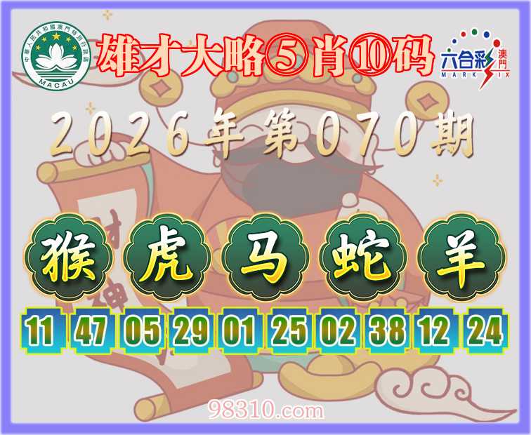 070期:『雄才大略』 ⑤肖⑩码【猴虎马蛇羊】开:马25准