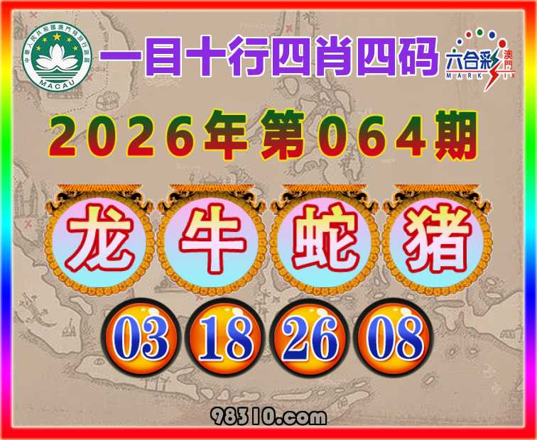 064期:〖一目十行〗 四肖四码【龙牛蛇猪】【03.18.26.08】开:牛18准